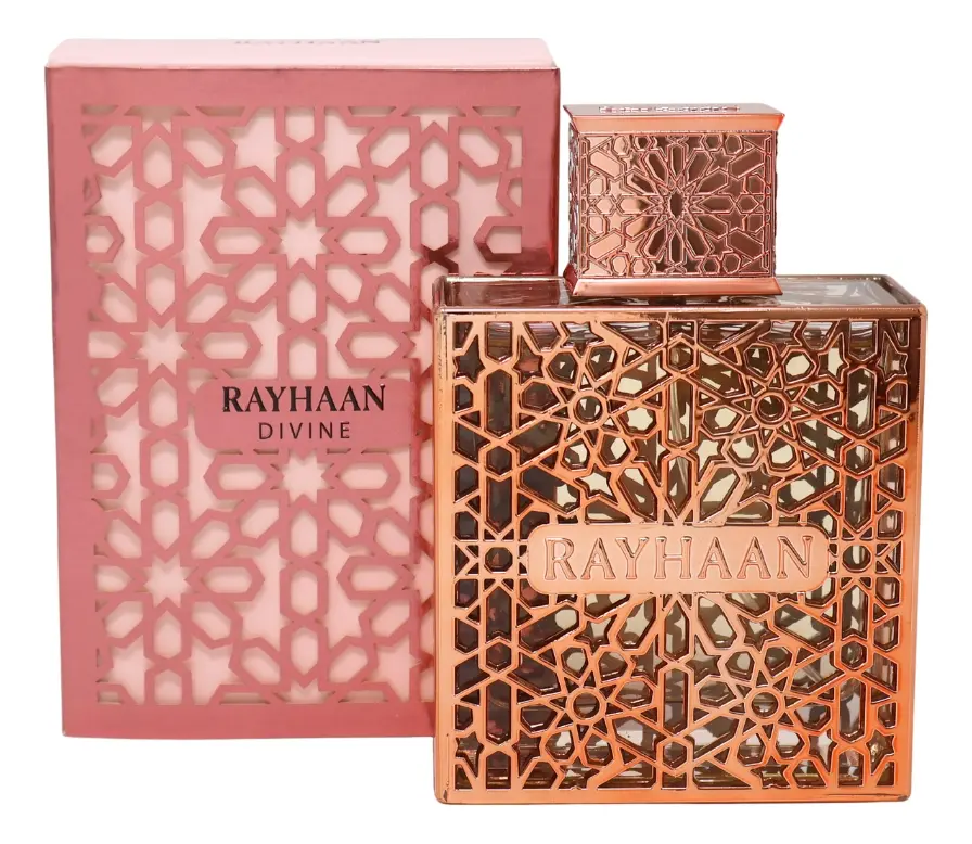 Rayhaan Divine de Rayhaan es una fragancia de la familia olfativa Floral para Mujeres. Esta fragrancia es nueva. Rayhaan Divine se lanzó en 2026. Las Notas de Salida son jengibre, lichi y bergamota; las Notas de Corazón son peonía, rosa y vainilla; las Notas de Fondo son pachulí y chocolate.